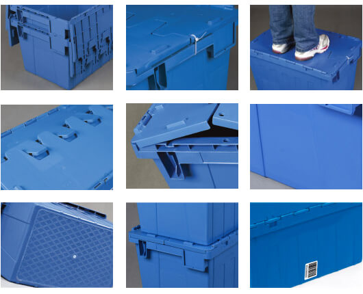 1. 物流箱為可插式、帶連體外翻箱蓋;把手搬運(yùn)舒適,空箱套入時(shí),把手在外。